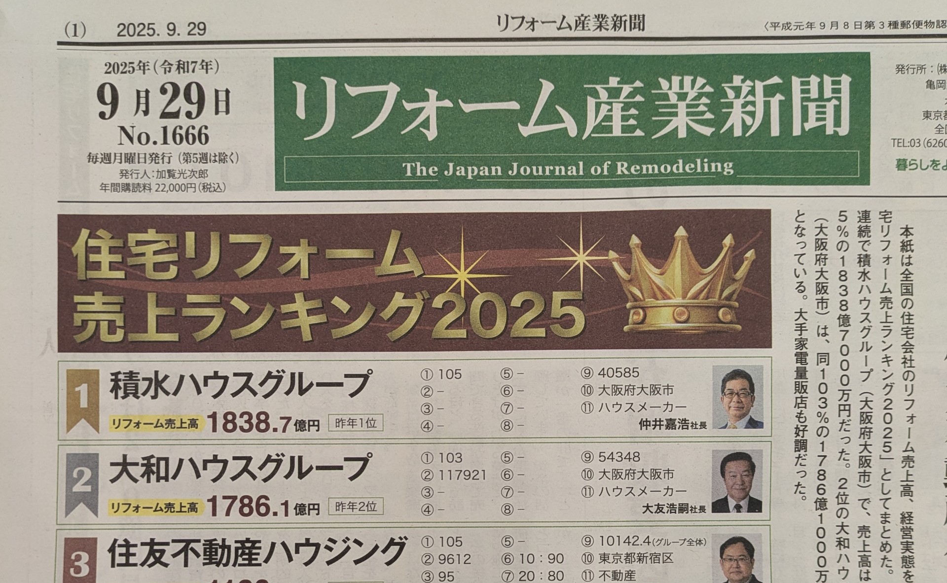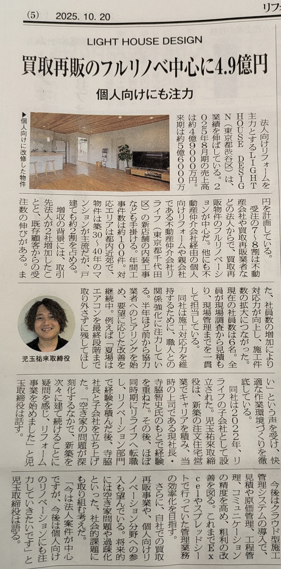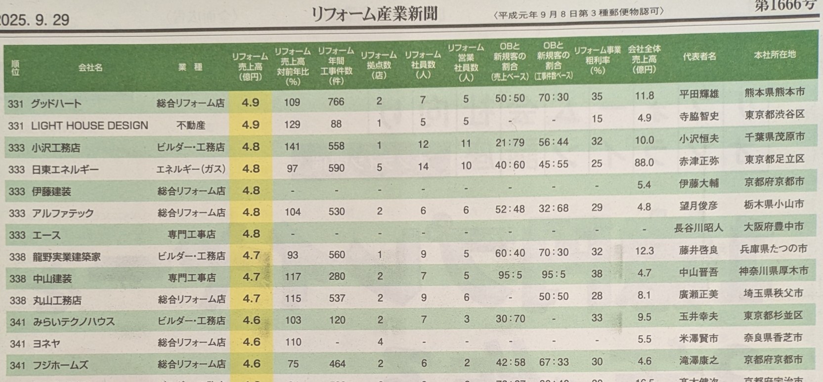 リフォーム業界の専門紙「リフォーム産業新聞」第1666号(2025年9月29」日号)の「リフォーム売上高ランキング2025」に当社子会社の株式会社LIGHT HOUSE DESIGNが331位にランキングされました。