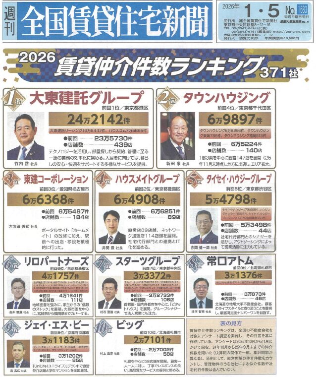 賃貸経営、賃貸管理・仲介、土地有効活用等の専門紙「全国賃貸住宅新聞」第1683号(2026年1月5日号)に掲載された「2026賃貸仲介件数ランキング」にて、当社が35位(仲介件数6,599件)にランキングされました。